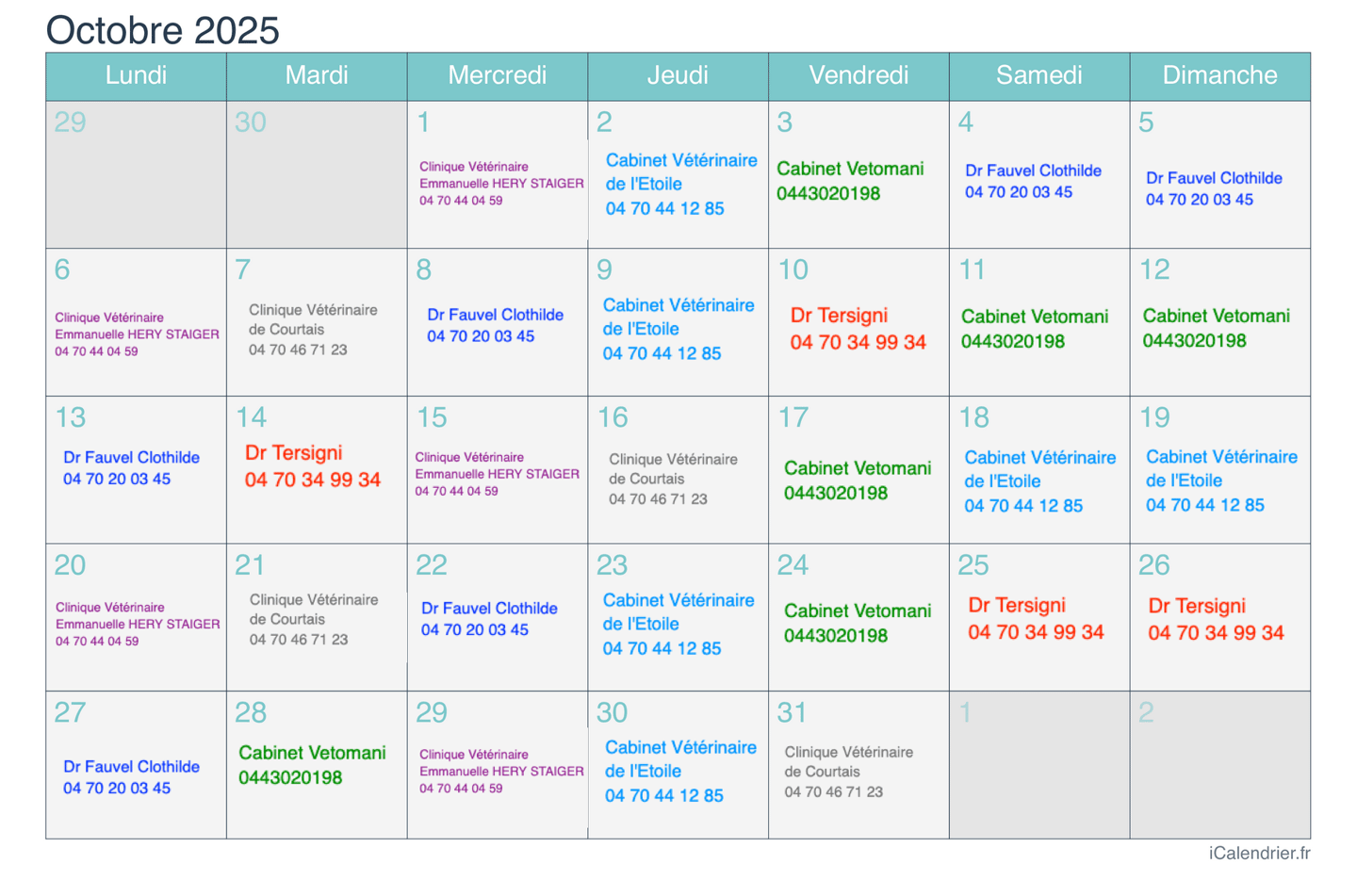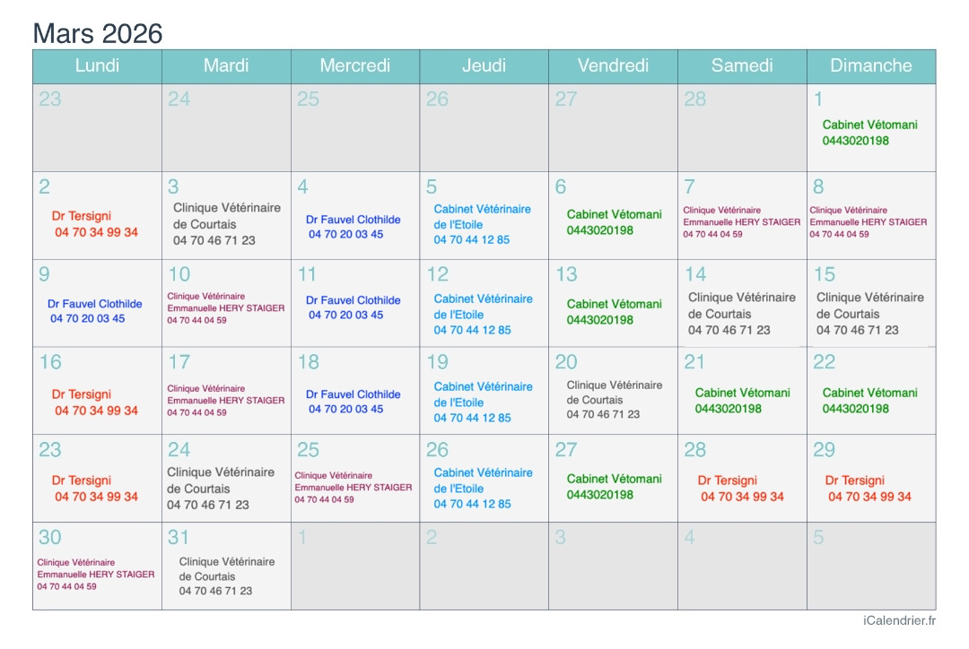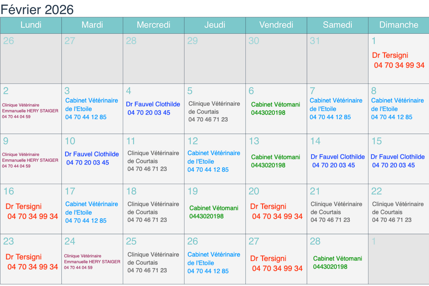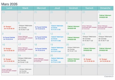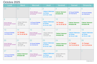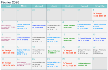voici le calendrier d'astreinte, renouvellé tout les mois